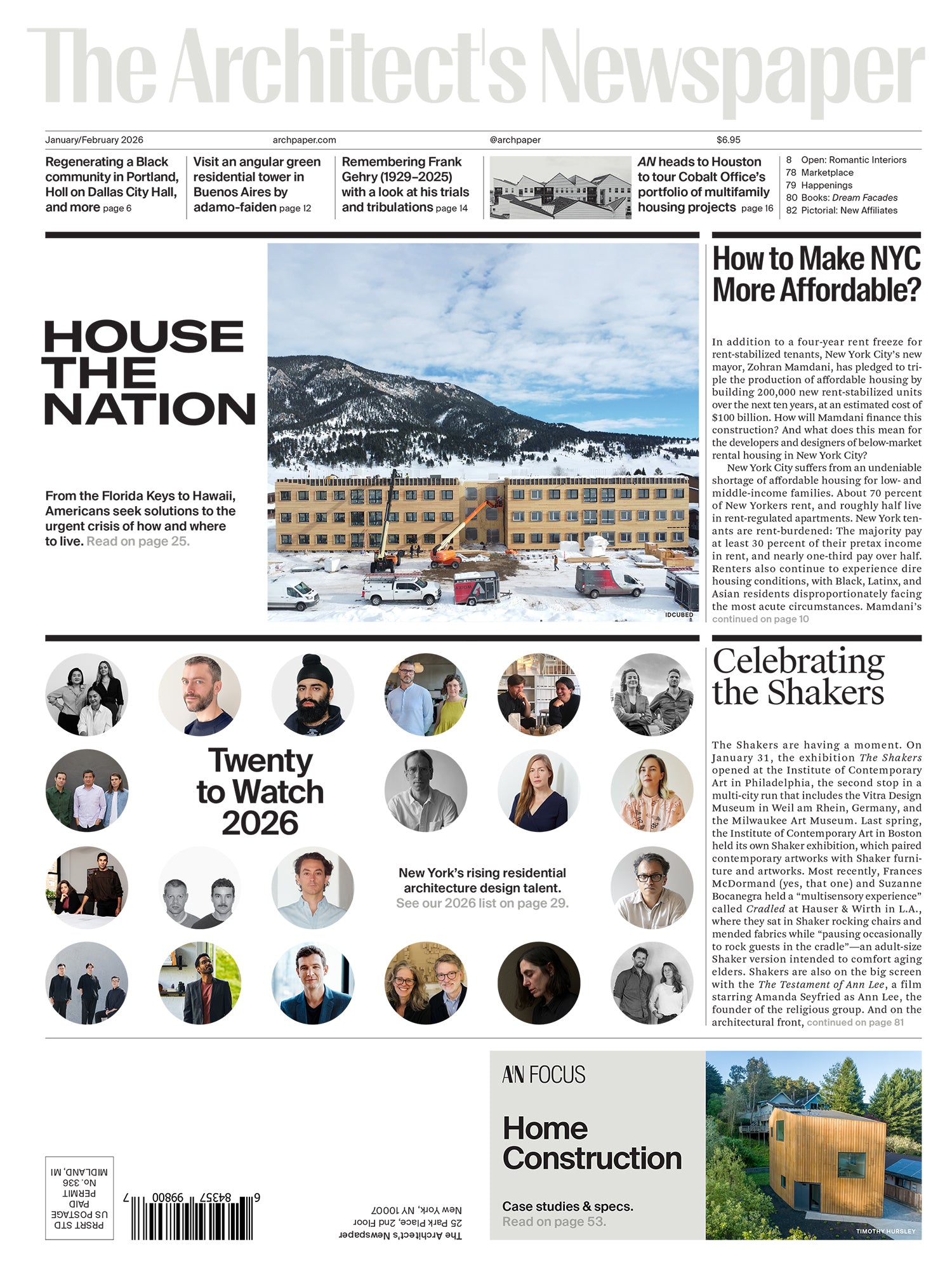 AN's January/February issue examines the urgent issue of housing. From the Florida Keys to Texas, the Mountain West, California, and Hawaii, see how architects are working to deliver housing, including in post-disaster scenarios. Our Focus section is devoted to home construction, with useful case studies and product pages. Don't miss additional news and reviews in the front and back of the issue, respectively. Plus: Check out the second version of our annual Twenty to Watch list, which recognizes rising residential architecture design talent in New York.